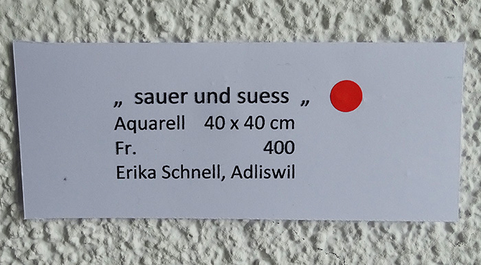 Noch bevor die Vernissage beginnt, hört man eine freudig-aufgekratzte Erika: «Ich hab' grad ein Bild verkauft!». Ihre Mit-Künstlerinnen beglückwünschen sie, alle gönnen ihr den schönen Moment. «Sauer und süss» heisst das Bild.