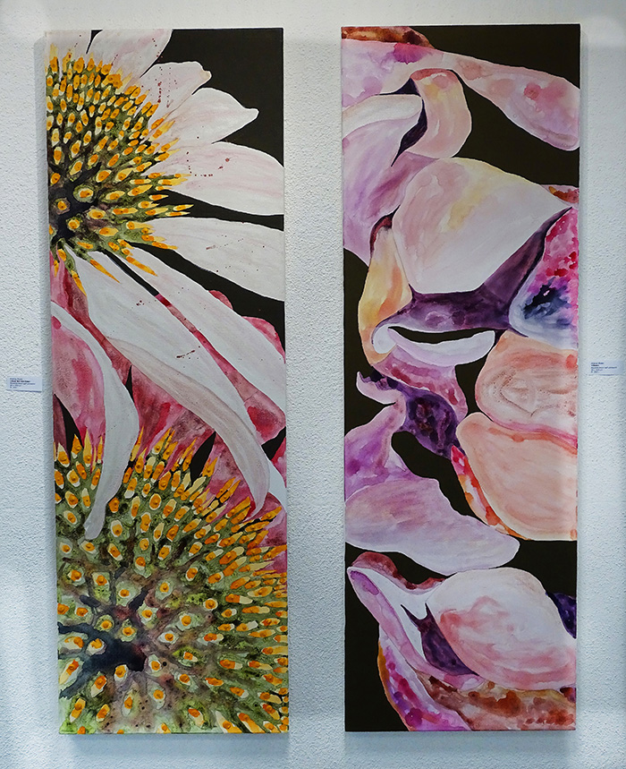 Ihre Malereien heben sich von allem Herkömmlichen ab. Erstens basieren ihre Werke auf fotografischen Vorlagen aus der Natur. Diese bearbeitet sie am Computer, reduziert, verfremdet, experimentiert. Das malerische Ergebnis sind geheimnisvolle «Pflanzen» – mit der Fantasie der Künstlerin komponiert.