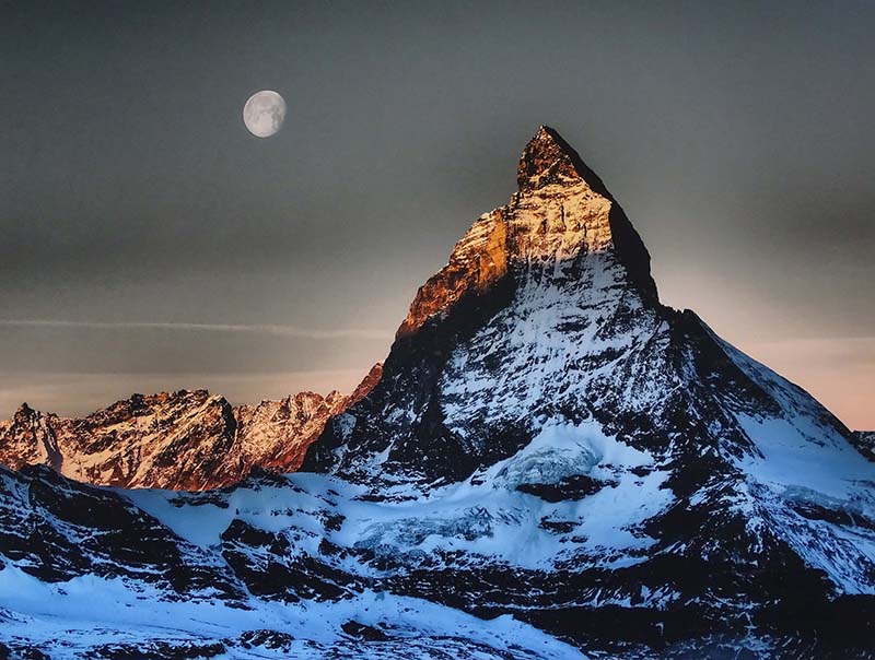 Matterhorn mit Mond. Fotografie, Fine Art Print auf Seidenstoff, 105x140cm.