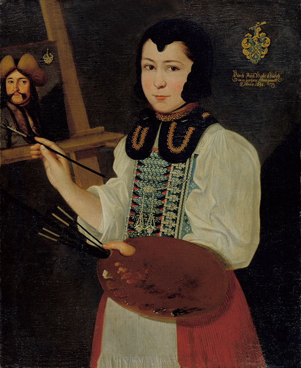 Dieses Gemälde ist ein gemeinsames Werk von Catharina und ihrem Bruder Nicolaus. Er porträtierte sie, und sie zeigt mit dem Finger auf ein Stillleben, das sie ins Bild eingefügt hat.