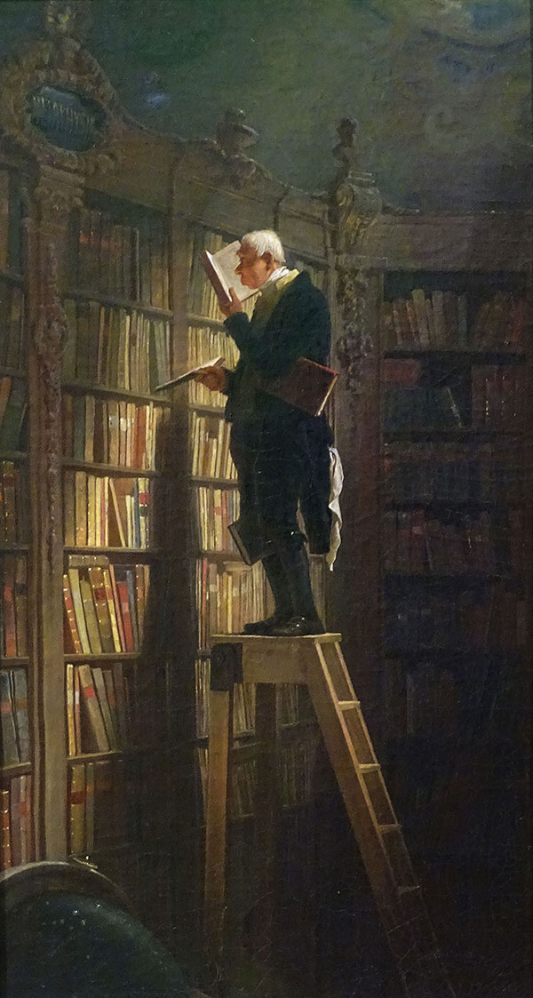 Wie der arme Poet wird auch der gelehrte Greis – eingeschlossen und isoliert in seiner Bibliothek – sein grosses Ziel nie erreichen. Er kann zwar tausend gescheite wissenschaftliche Bücher lesen, aber am Ende wird er die Welt doch nicht verstehen. Spitzweg karikiert mit diesem Werk die hoffnungslose Lage der Intellektuellen in ihrer selbst gewählten Isolation. |