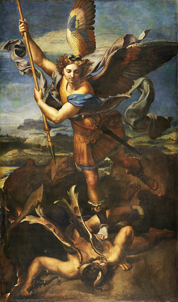 Eine der dramatischsten Szenen der Bibel: Erzengel Michael, Anführer der himmlischen Engelscharen und in Gottes Diensten, kämpft gegen Satan und dessen böse Engel. In der Offenbarung 12:7-9 wird das so beschrieben: «Und es entbrannte ein Kampf im Himmel. Michael und seine Engel kämpften gegen Satan und seine Engel».