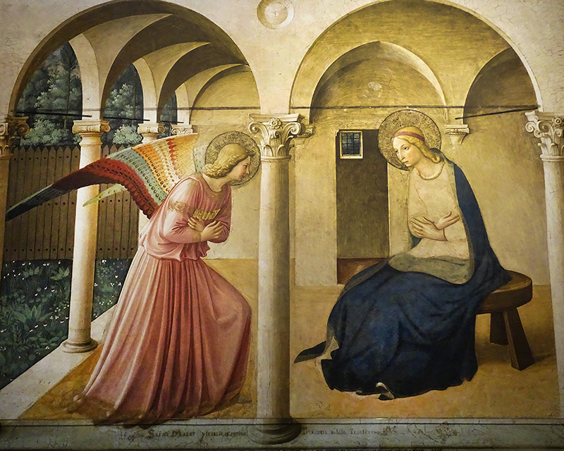 Engel Gabriel bei der Verkündigung. Von Fra Angelico (1395-1455). L'annunziazione, 1442. Dormitorio des Klosters San Marco, Florenz.