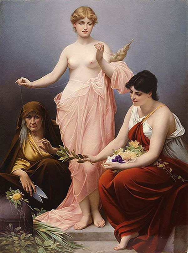 Die Moiren Klotho, Lachesis und Atropos.