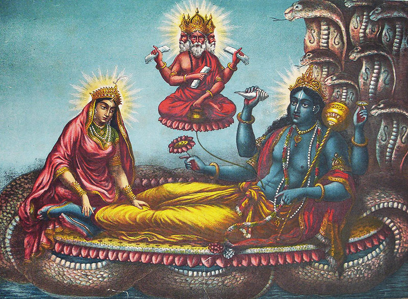 Vishnu liegt auf der Schlange, zu seinen Füssen die Gattin Lakshmi. Brahma schwebt auf einer Lotusblume. Litho aus einem Album, 1870. British Museum, London. |