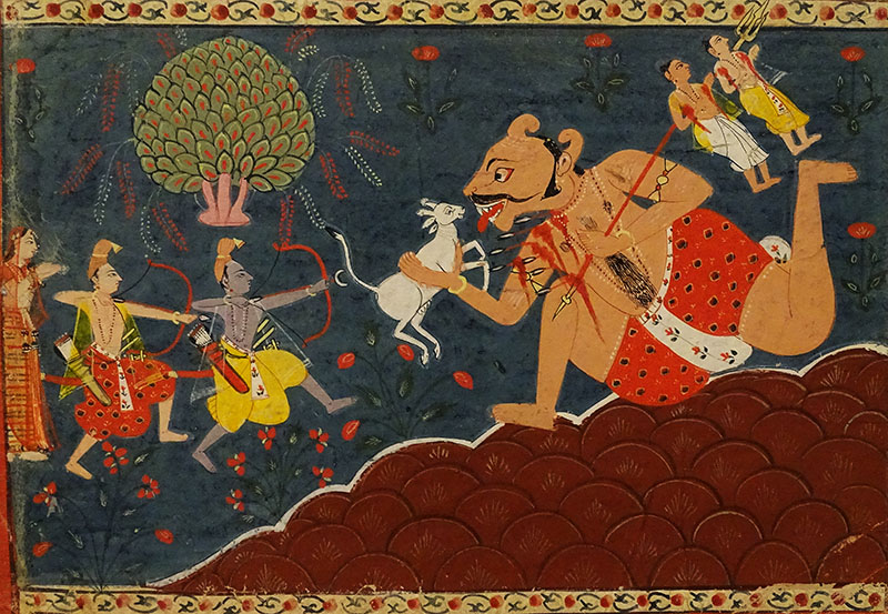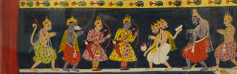 Der Affengott Hanuman und der Bärengott Jambavan erweisen den Brüdern Lakshmana und Rama die Ehre. Rechts aussen v.l.n.r. die Götter Brahma (mit den vier Köpfen), Shiva und Indra. Aus einer Ramayana-Serie, 1650-60. Sammlung Eva und Konrad Seitz, Museum