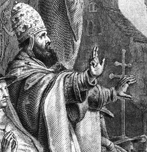 Papst Urban II ruft 1095 zum ersten Kreuzzug auf. Stich aus dem 18.Jht.