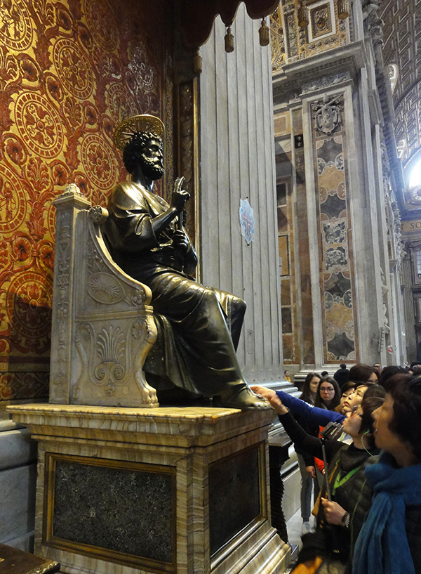 Eine der Hauptattraktionen im Petersdom für Pilger und Touristen: die Bronzestatue des hl. Petrus. Von Arnolfo di Cambio. |