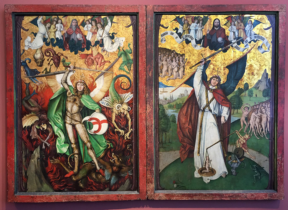 Zürcher Nelkenmeister (Hans Leu der Ältere). Tafeln eines Michael-Altars, um 1495. Der Höllensturz. Erzengel Michael überwindet Luzifer. Das Jüngste Gericht, Erzengel Michael als Seelenwäger.