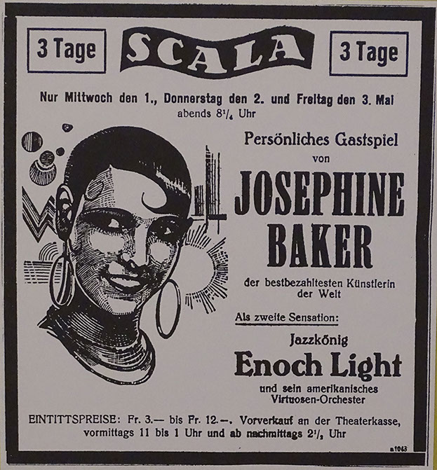 Josephine Baker, Inserat 1929 für Jazzorchester Enoch Light im Kino Scala, Zürich. Quelle Heinrich Baumgartner.