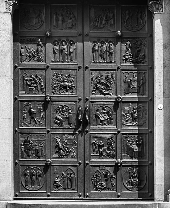Das Hauptportal mit der Bronzetüre von Otto Münch (1885-1965), erschaffen 1950.