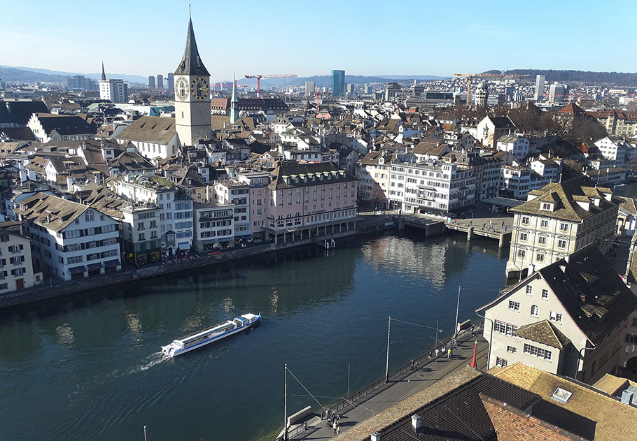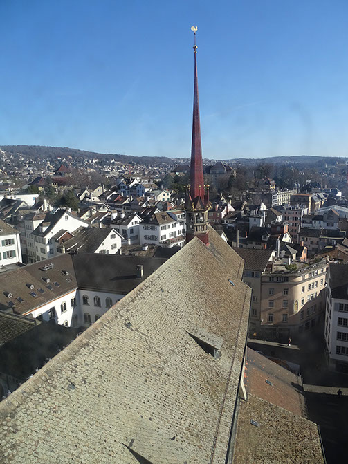 Blick vom Karlsturm auf die Spitze des Fraumünsters.
