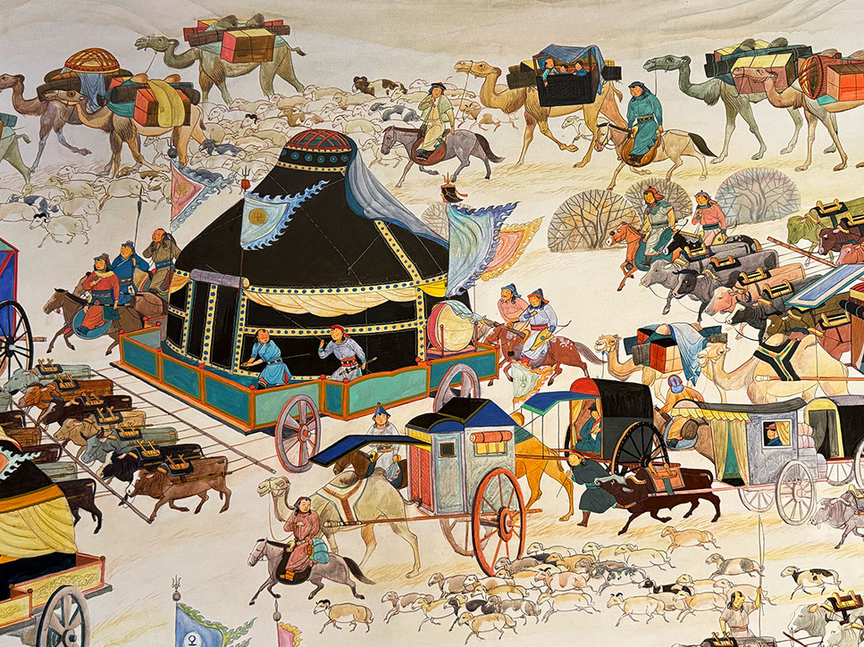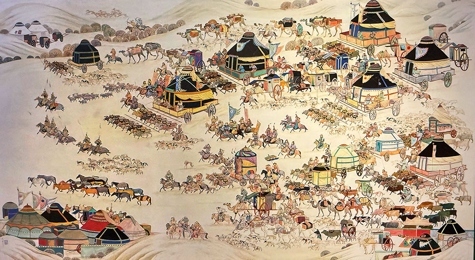 Das Leben in Jurten. Amarsanaa, Galmandakh (*1973). Der grosse Umzug, Mongolei, 2025. 180x300cm. Lkham Gallery.