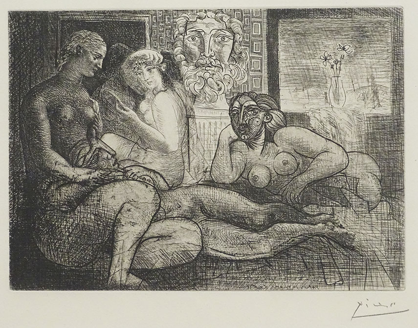 Pablo Picasso (1881-1973). Quatre femmes nues et tête sculptée, de la Suite Vollard, 1934. Sammlung Werner Coninx.