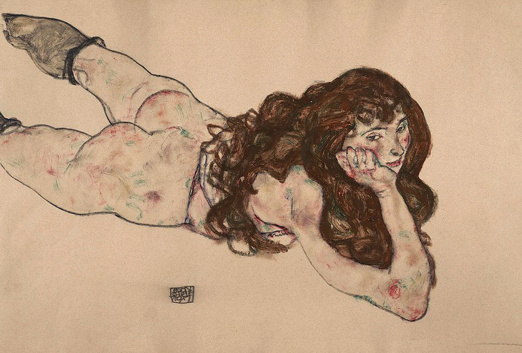 1917-Egon Schiele (1890-1918). Auf dem Bauch liegender weiblicher Akt, 1917. Albertina Wien.