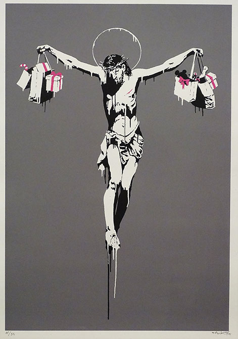 Banksy (1974?). Christ with Shopping Bags, 2004. Moco Museum Amsterdam.