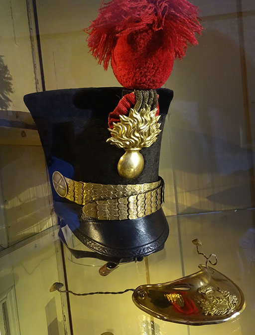 Der Tschako Napoleons III und Hausse-Col (Metallplakette mit Wappen).