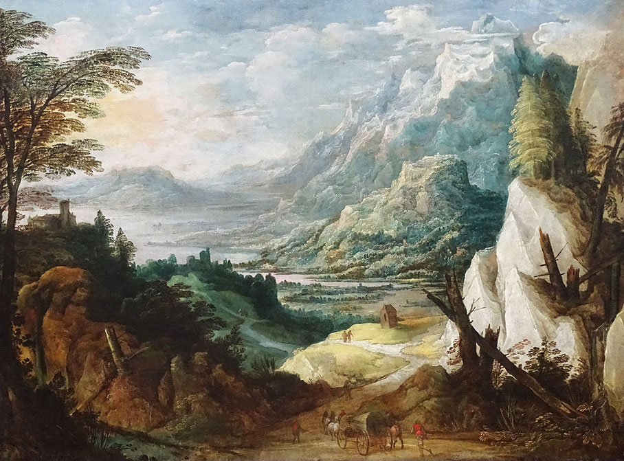 Joos de Momper (1564-1635). Gebirgslandschaft mit zuerborstenen Bäumen, 1628.