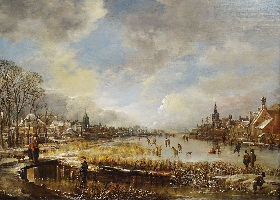 Aert van der Neer (1603-1677). Zwei Städtchen an einem zugefrorenen Fluss mit Golfspielern und Eisläufern, 1660-65.