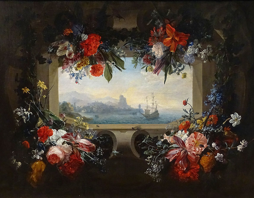 Johann Rudolf Bys (1662-1738). Blumenstillleben mit Vedute in einer Kartusche, 1713.