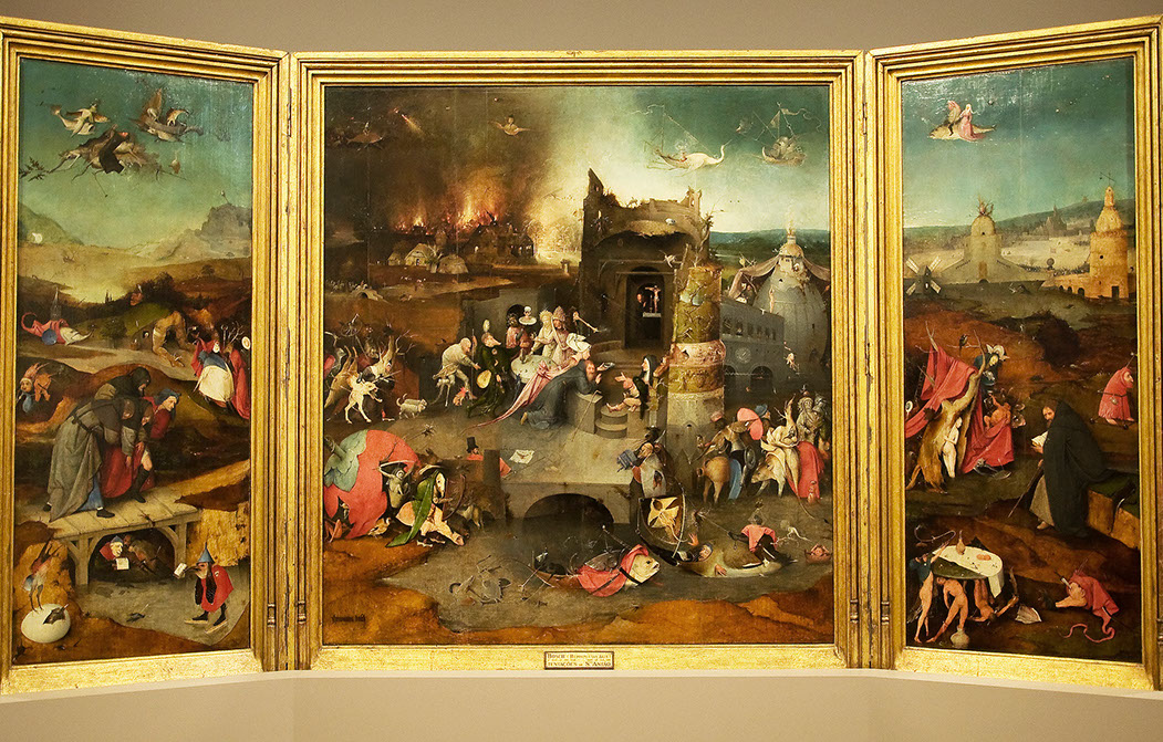 1495-Hieronymus Bosch (1450-1516). Die Versuchung des hl. Antonius, 1495-1515. Museu Nacional de Arte Antiga, Lisboa.