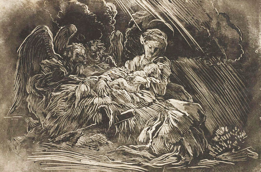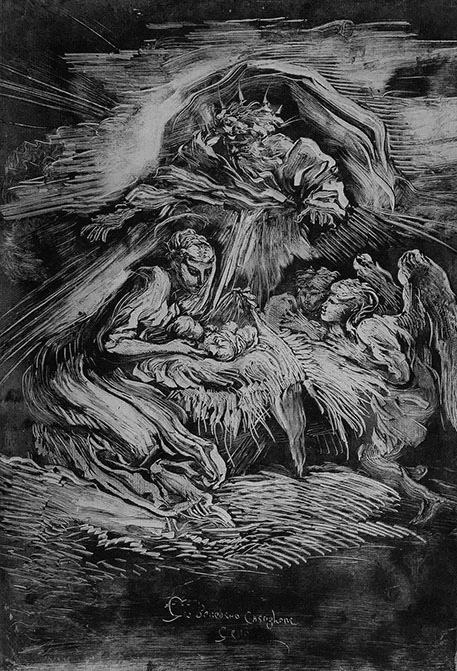 1655-Castiglione (1609-1664). Geburt Christi mit Gottvater und Engeln, um 1655. Bibliothèque nationale de France, Paris.