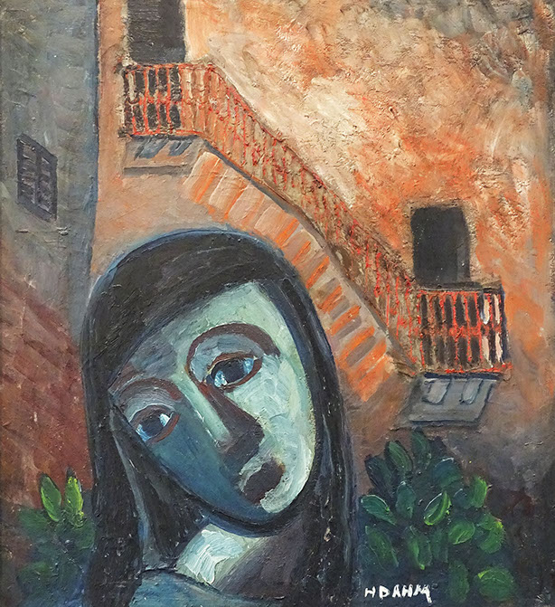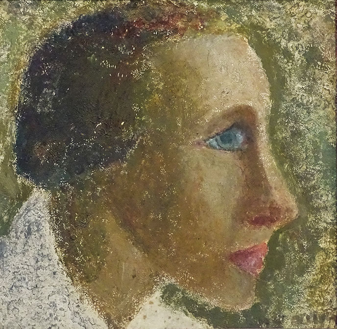 Helen Dahm (1878-1968). Blauer Frauenkopf vor rotem Haus, 1940. Kunstsammlung Stadt Zürich.