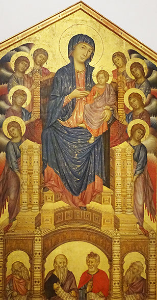 Duccio di Boninsegna (1278-1311). Madonna in trono col Bambino fra angeli, Maesta di Santa Maria Novella, 1285.