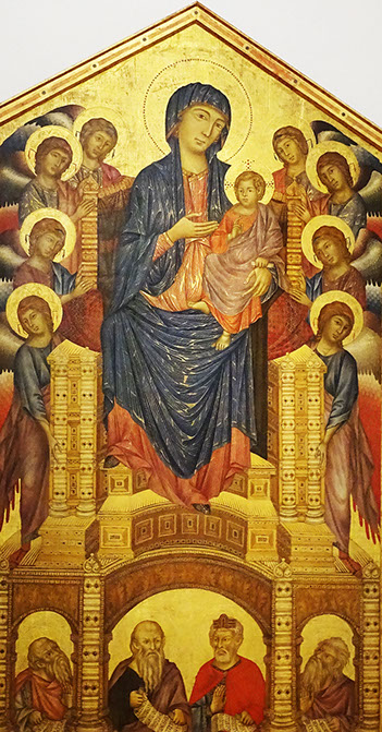 Cimabue (1272-1302). Madonna in trono col Bambino fra angeli e profeti, Maesta di Santa Trinita, 1290-1300.