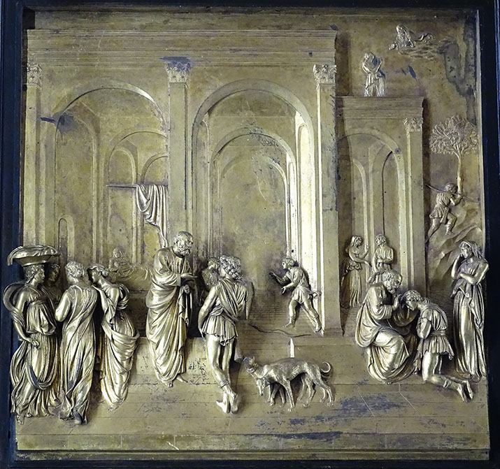 Lorenzo Ghiberti (1378-1455). Porte del Paradisio, 1425-1452. Einzelkachel 4. Altes Testament.