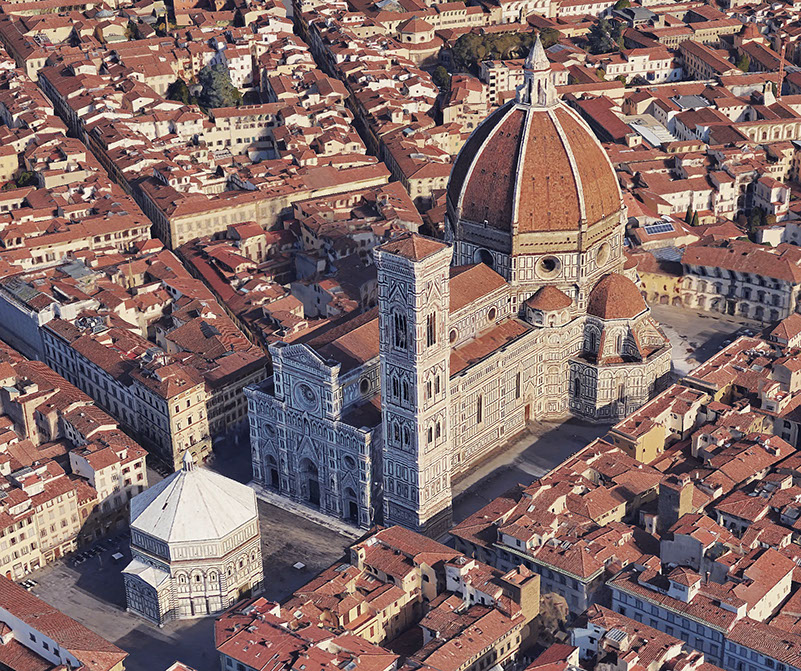Piazza San Giovanni mit Battisterio, Westfassade Duomo, Campanile, Kathedrale. Foto Google Earth.