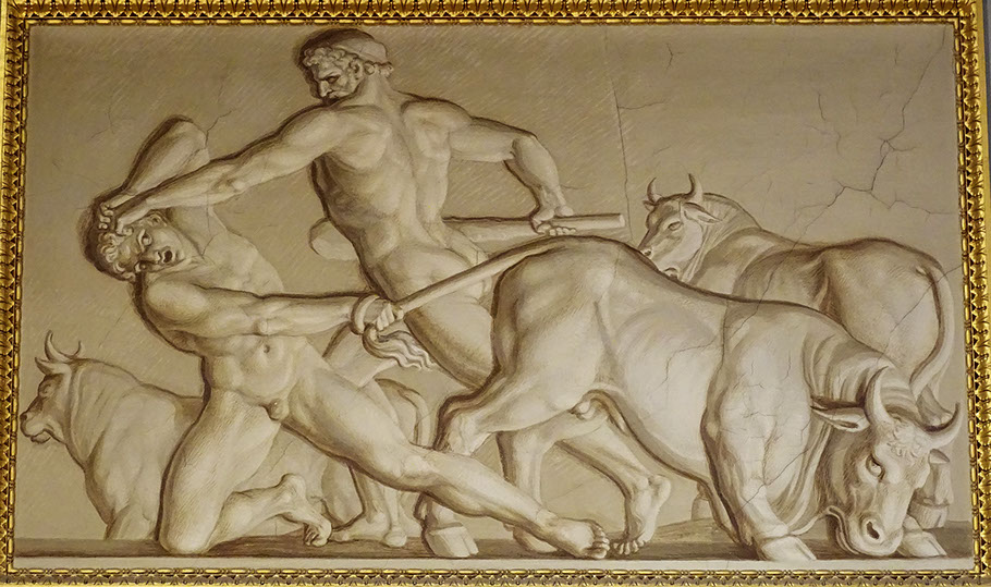 Saal des Herkules. Herkules kämpft mit den Zentauren, die seine Frau Deianira entführen.