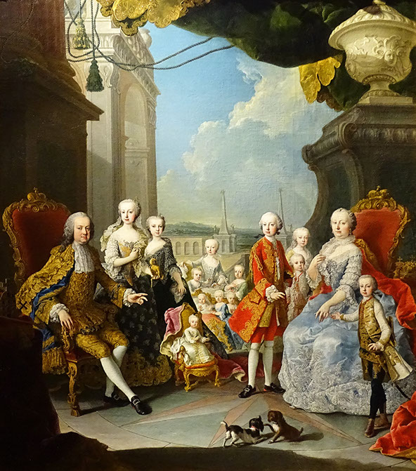 Martin van Meytens (1695-1770). Maria Teresa e Francesco I d'Austria con i figli a Schönbrunn, 1756. Detail.