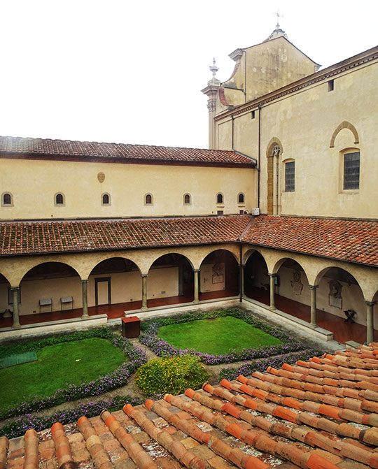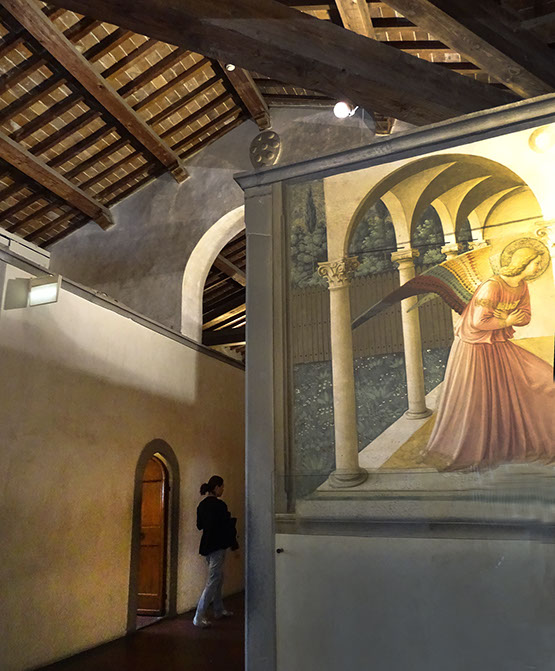 Treppe zum Obergeschoss und ins Dormitorium. Fresko von Fra Angelico, Verkündigung.
