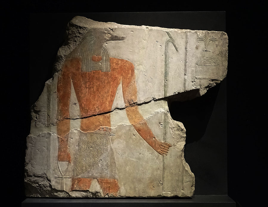 2480 v.Chr. Schakalköpfiger Gott. Relief aus dem Totentempel des Pharao Sahure, Abusir, Altes Reich 5. Dynastie.