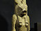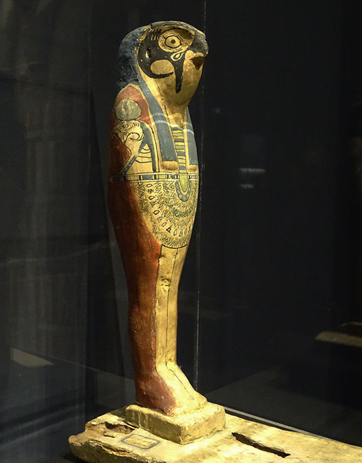 500 v.Chr. Schutzgottheit mit dem Kopf eines Falken. Ägypten, ptolemäisch. Holz, bemalt. Liebighaus Frankfurt.