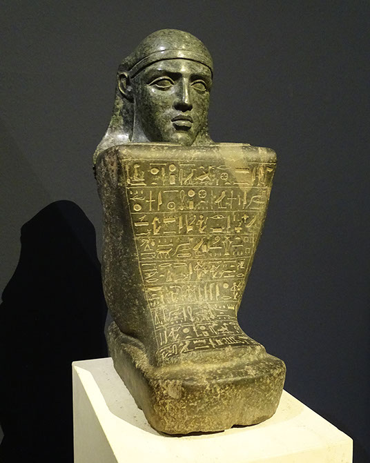 610 v.Chr. Würfelhocker des Wesirs Na-secheper-en-Sachmet. Ägypten, Sais, 26. Dynastie, 664-610 v.Chr. Grauwacke.