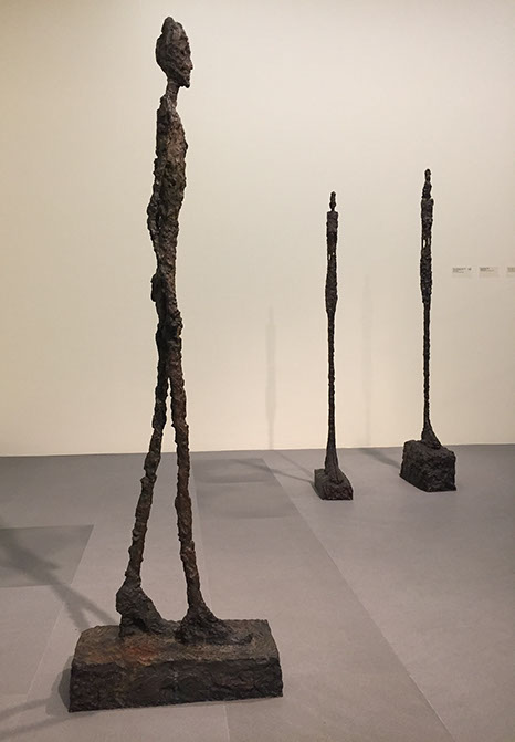 Alberto Giacometti, Homme qui marche, 1947. In Hintergrund zweimal die stehende Frau, 1948.
