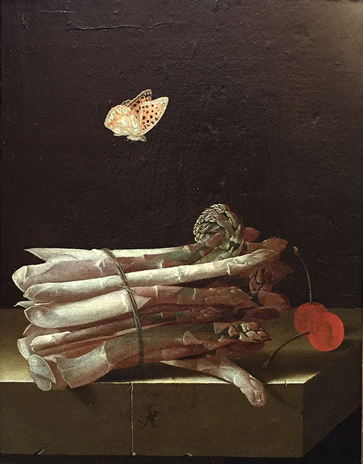 Adriaen Coorte, IJzendijke (Sluis), Spargelbund mit Kirschen und Schmetterling, um 1693-1695.