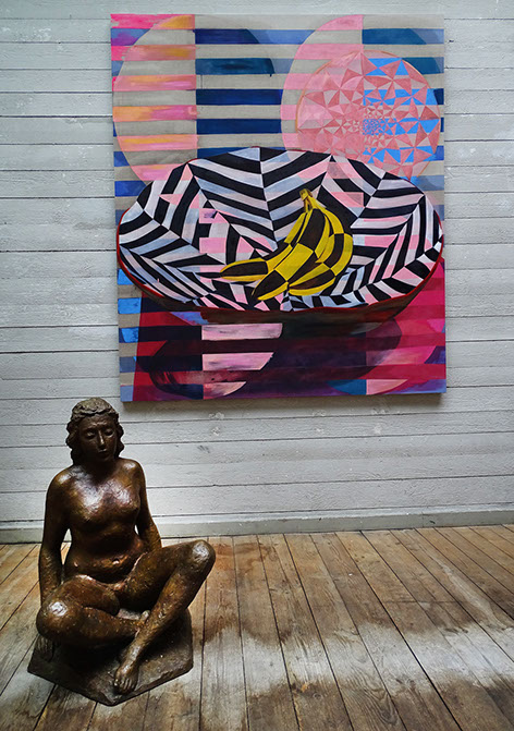 Athene Galiciadis (1978). Gemälde Stillleben (Drei Bananen und zwei Gefässe), 2020. Skulptur Hermann Haller.