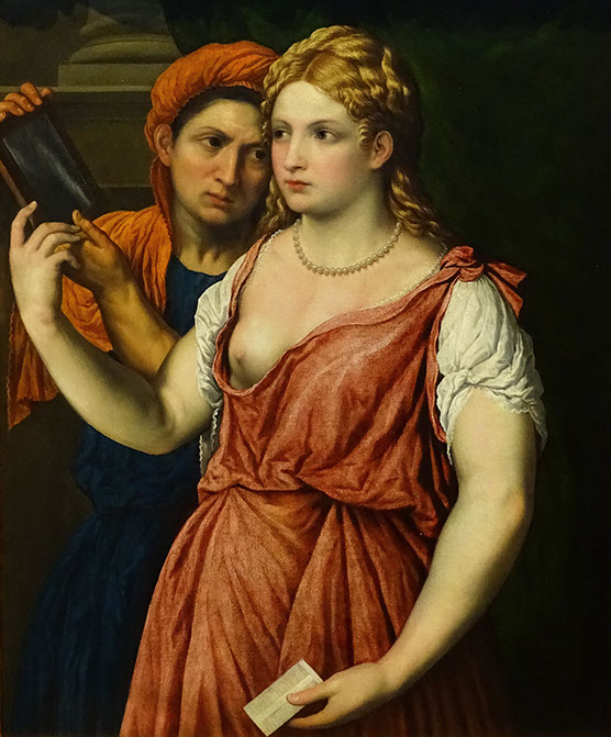 Paris Bordone (1500-1571). Junge Dame mit Spiegel und Magd, 1535-1540.