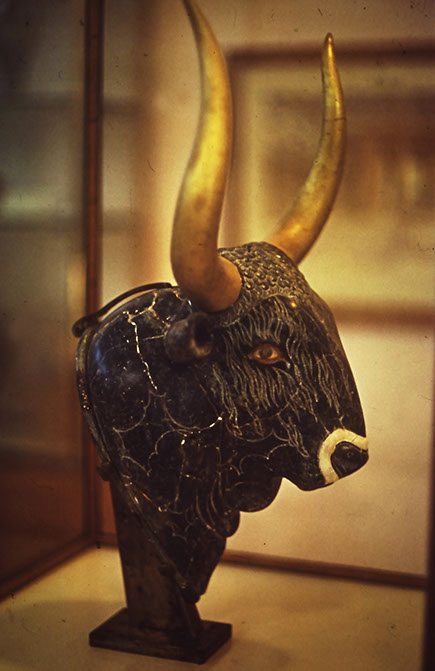 Trankopfervase in Form eines Stierkopfes. Vergoldete Hörner. Augen aus Bergkristall. Museum Heraklion.