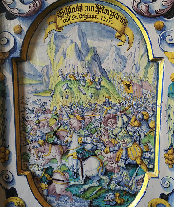 Die Mutter aller Schweizer Schlachten: Morgarten, 1315. Abbildung auf einem Kachelofen im Seidenhof-Zimmer.