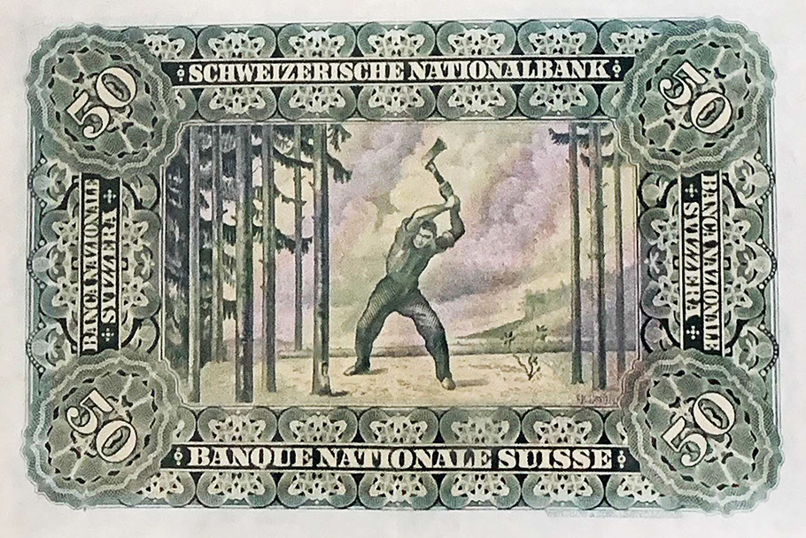 Ferdinand Hodler (1853-1918). Der Holzfäller auf der 50-Franken-Banknote 1911-1958. Schweizerische Nationalbank.