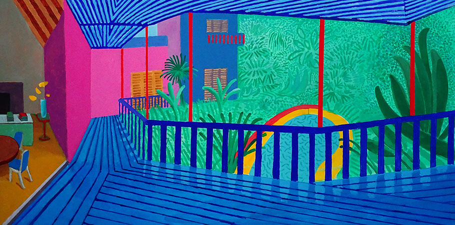 2017-David Hockney (1937). Interior with Blue Terrace and Garden, 2017. Privatsammlung.