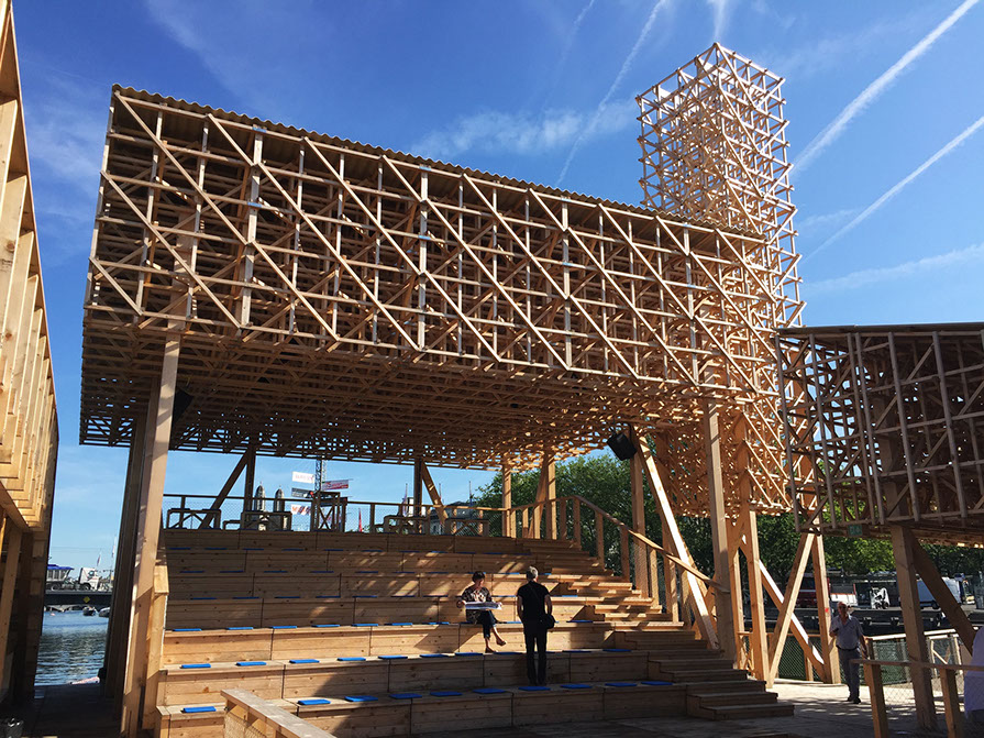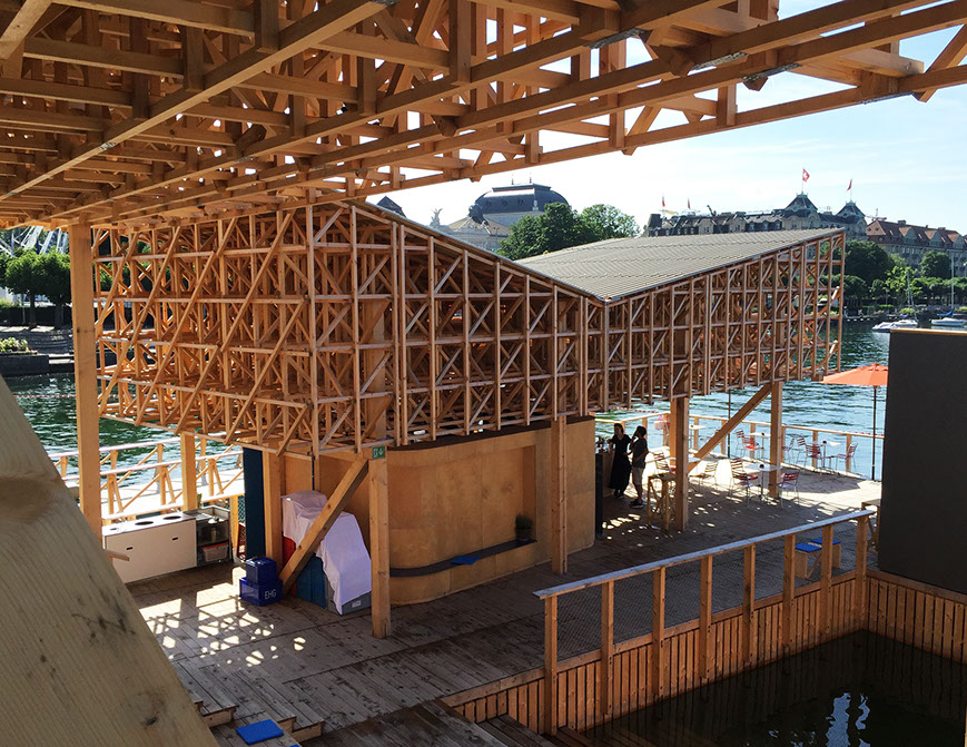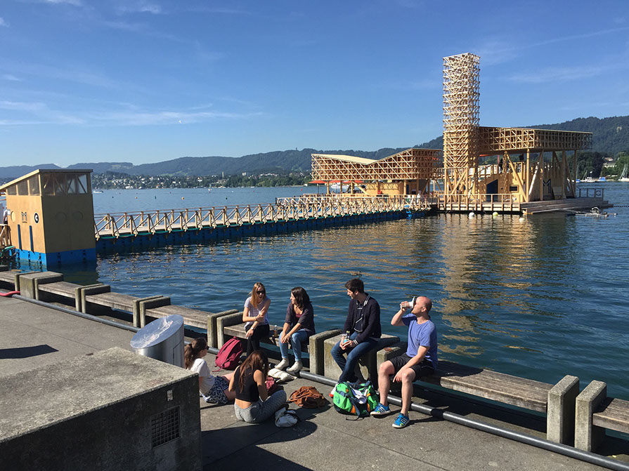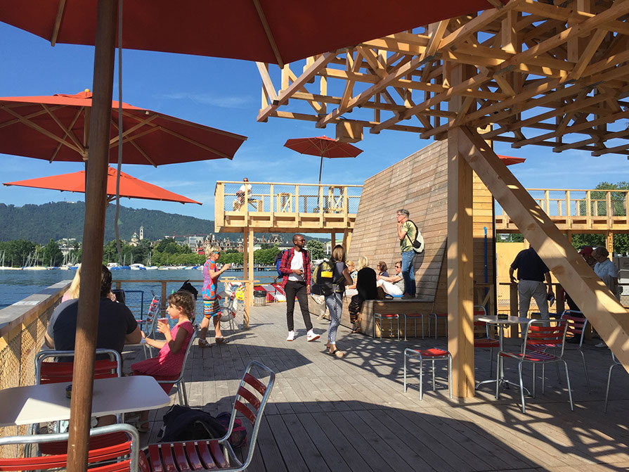 «Pavillon of Reflections», der schwimmende Treffpunkt auf dem Zürichsee mit Kino, Bar, Schwimmbad und Auditorium lädt die Besucher ein, über die Kunstwerke nachzudenken.