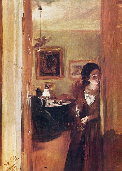 1847-Adolph von Menzel (1815-1905). Wohnzimmer mit Menzels Schwester, 1847. Neue Pinakothek München.