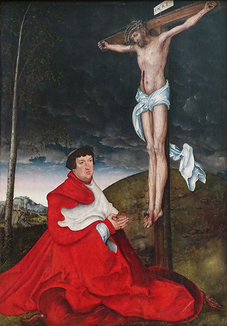 Lucas Cranach d.Ä. (1472-1553). Kardinal Albrecht von Brandenburg vor dem Gekreuzigten. Alte Pinakothek München.