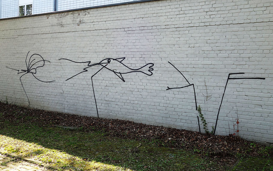 Harald Naegeli (1939). Fisch 2017, Rheinkniebrücke, Parkplatz, Düsseldorf. Foto Jula 2812, WikiCommons.