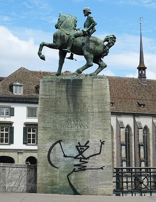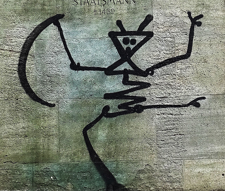 Harald Naegeli (1939). Der hüpfende Sensenmann aus der Serie Totentanz, 2020. Denkmal Hans Waldmann, Zürich.
